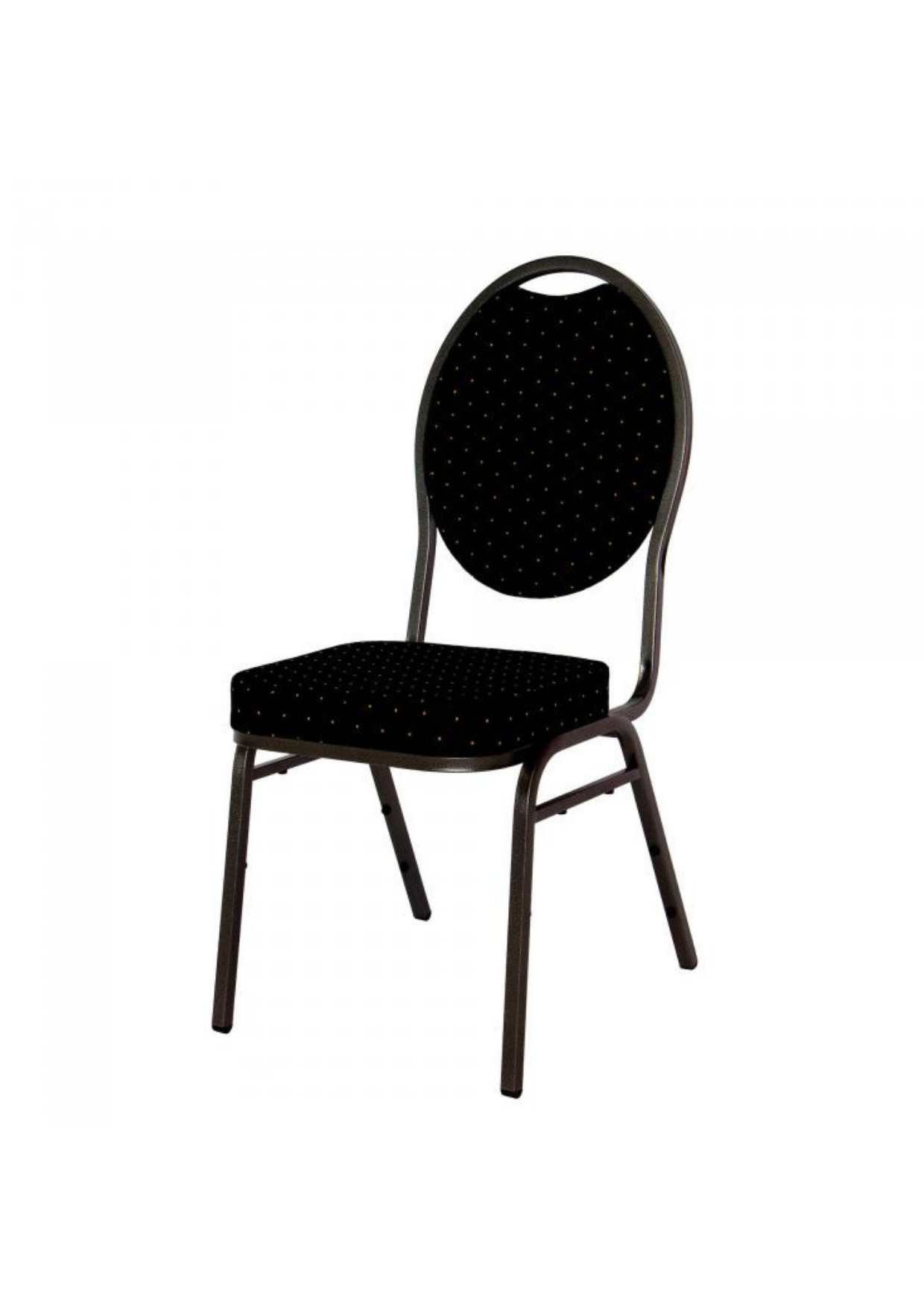Stapelbare horeca-stoel met brandveilige polyester stoffering, stalen frame en comfortabele gevulde zitting en rugleuning, geschikt voor professioneel gebruik.