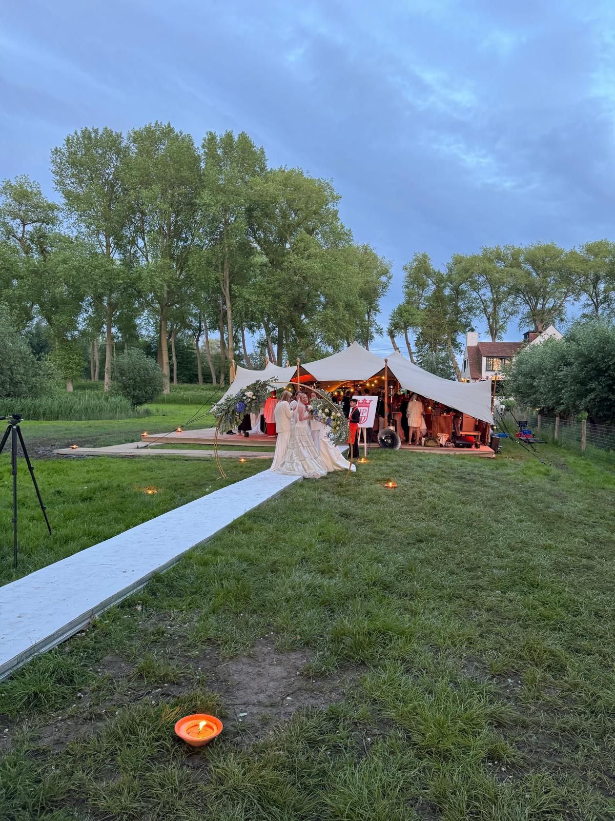 Voor dit stijlvolle tuinfeest zorgden we voor een complete totaalbeleving midden in het groen. Onder een grote beige stretchtent met houten palen creëerden we een open maar beschutte setting, perfect voor een zomerse receptie en avondfeest..